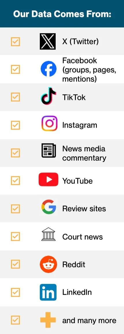 Social media, news media, websites, forums, discussion pages. If it’s out there, we can analyse and present what is being said back to you.